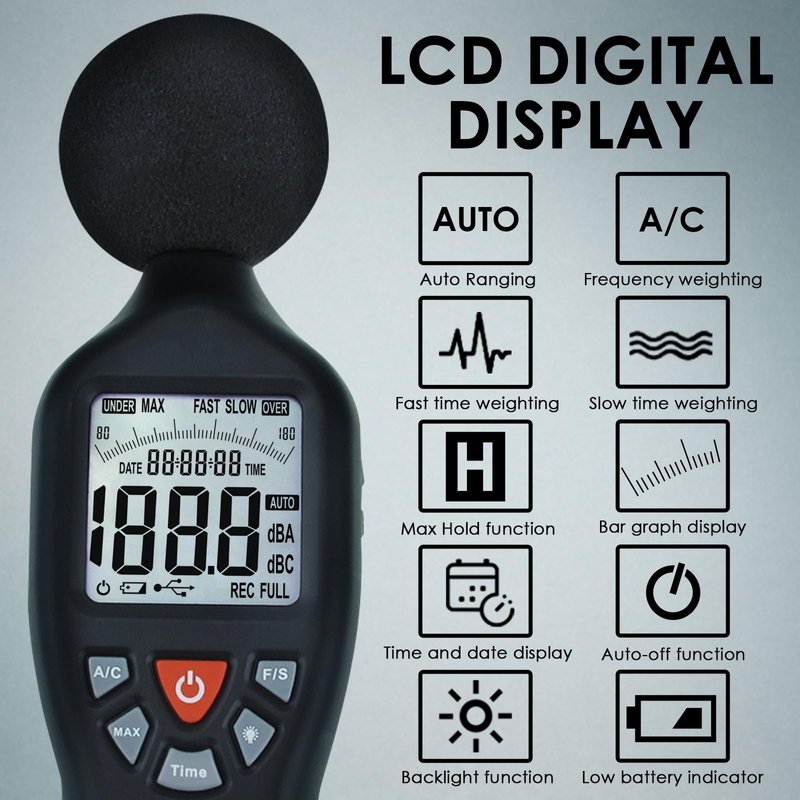 - 🔊LCD DIGITAL DISPLAY : The Data Logging Function Sound Level Decibel Meter with Backlight Display High Accuracy,LCD digital ,display can shows a 3-digit decibel level values, Auto Ranging Bar graph level, time and date.