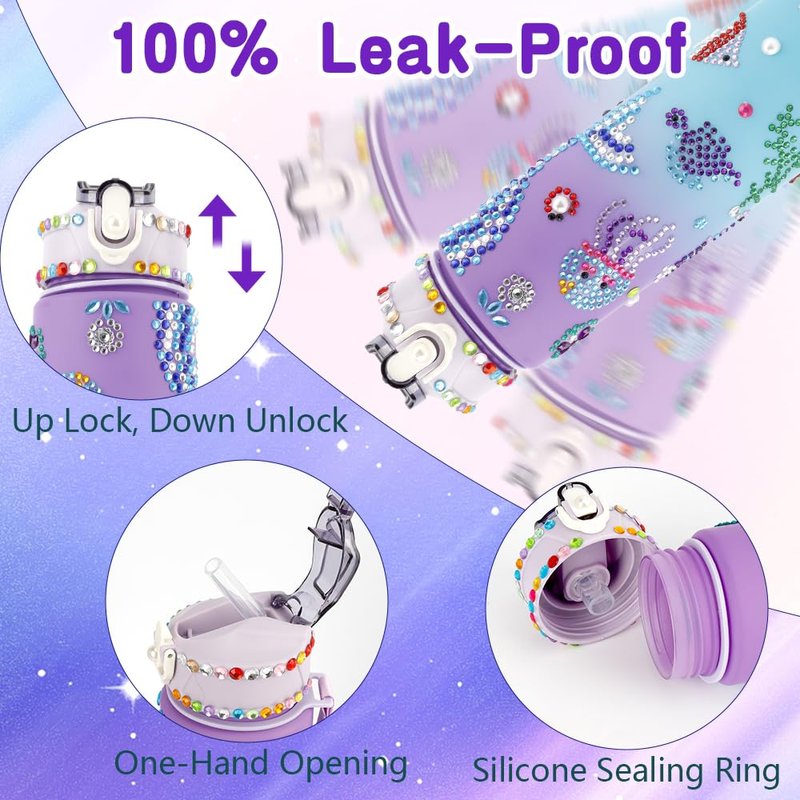 - High Quality Water Bottle: The children's water bottle with gemstone art stickers is designed with a food grade silicone sealing ring, non-toxic, odorless, BPA free, lightweight, and a convenient pop-up cap that allows for easy drinking with just one click, perfect for children