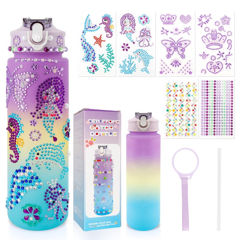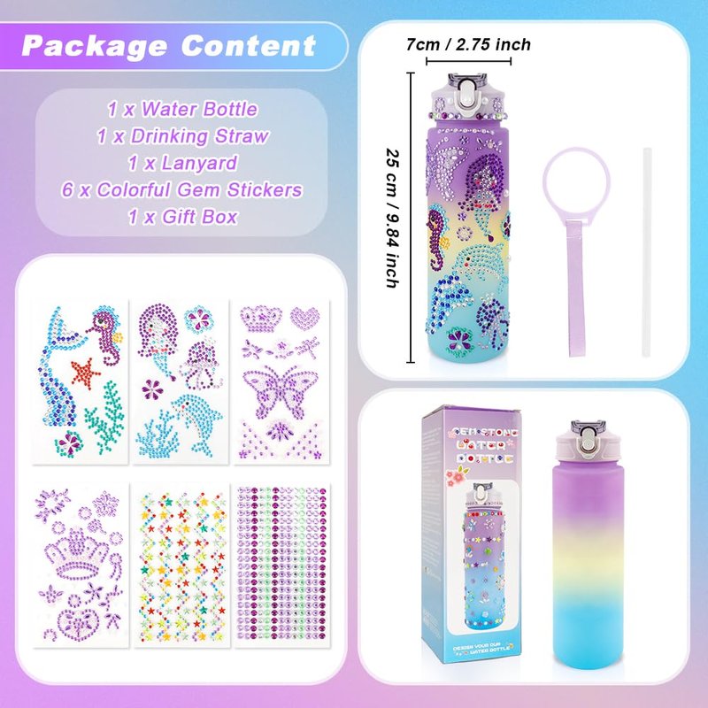 - Decorate Your Own Water Bottle Kits: Our DIY water bottle come in exquisite packaging, ideal birthday gift set for girls. This water bottle kits includes 750ml/25oz water bottle x1, gemstone sticker x6, Drinking Straw x1, Lanyard x1.There are not only enough colorful and glittery gems stickers for girls and boys to decorate their own water bottle, but also practical accessories make it convenient to use in daily lives.