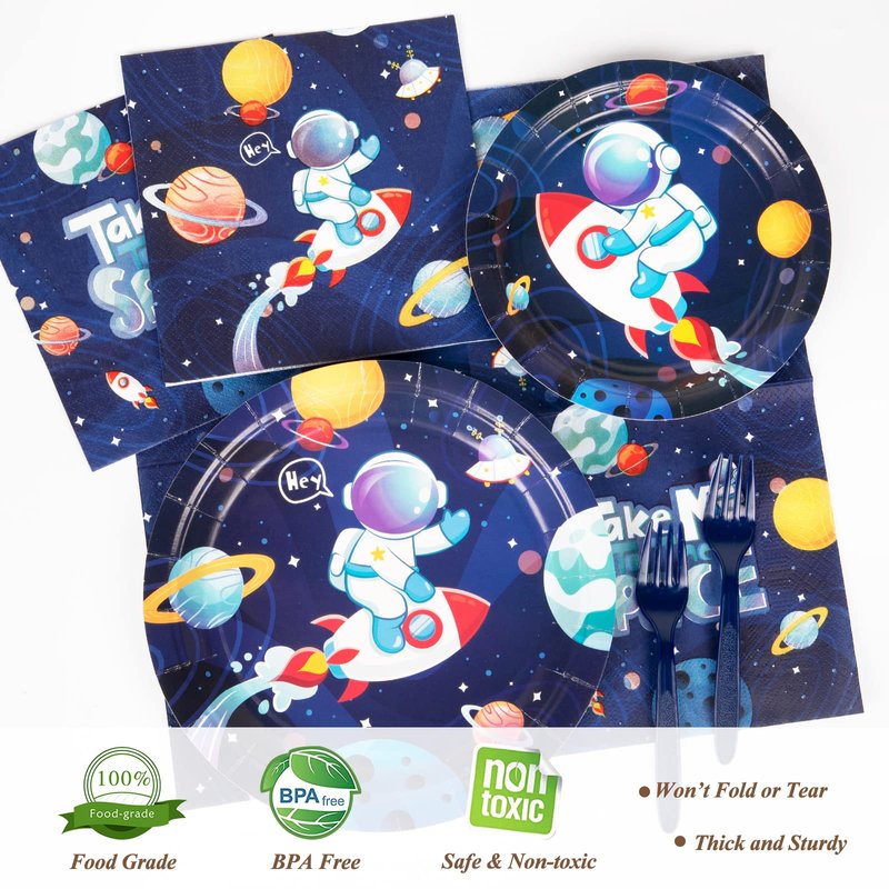 DECORLIFE Space Themed Party Supplies Serves 24, Space Birthday Decorations for Boys, Complete Pack Includes Astronaut Rocket Plates and Napkins, Forks, Total 96PCS