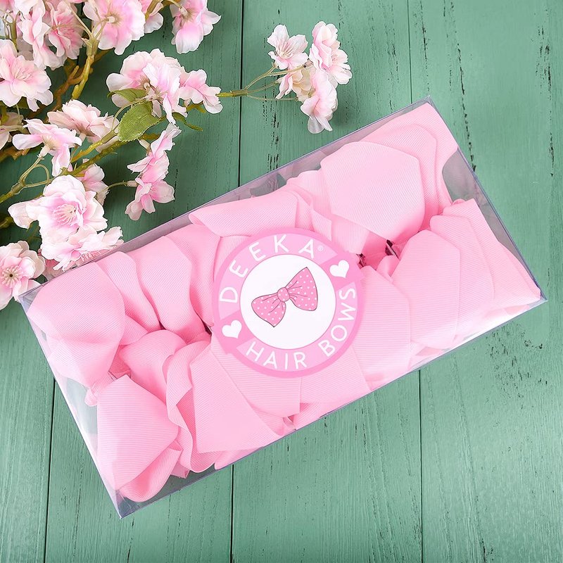 - DEEKA Hair Bows are 6" across (hand-made, please allow the discrepancy) with a 2.2 lined alligator clip, using 2" grosgrain ribbon. One bow weight: 0.5 ounce, Color of Solid Light Pink