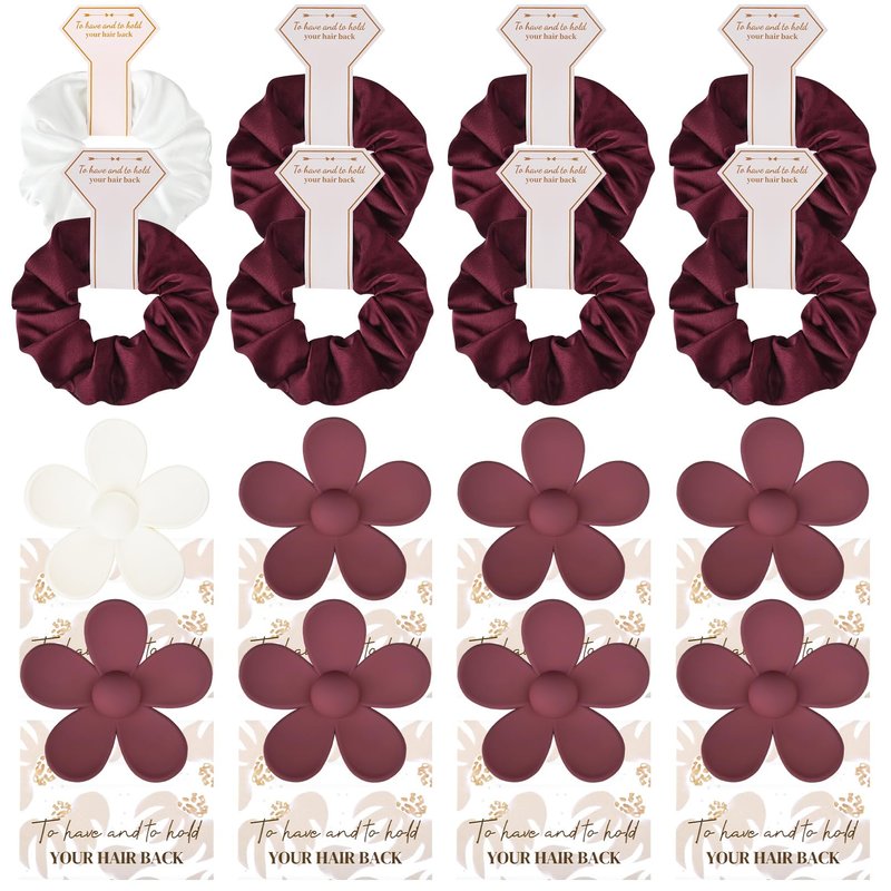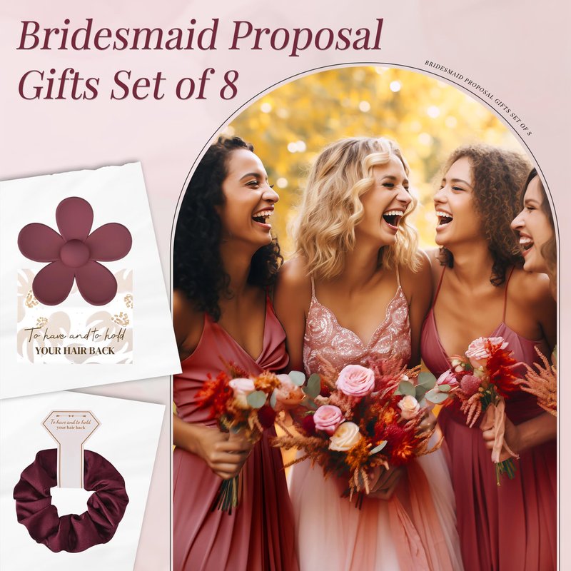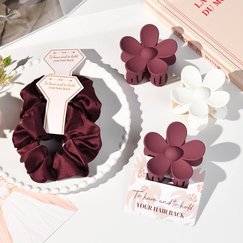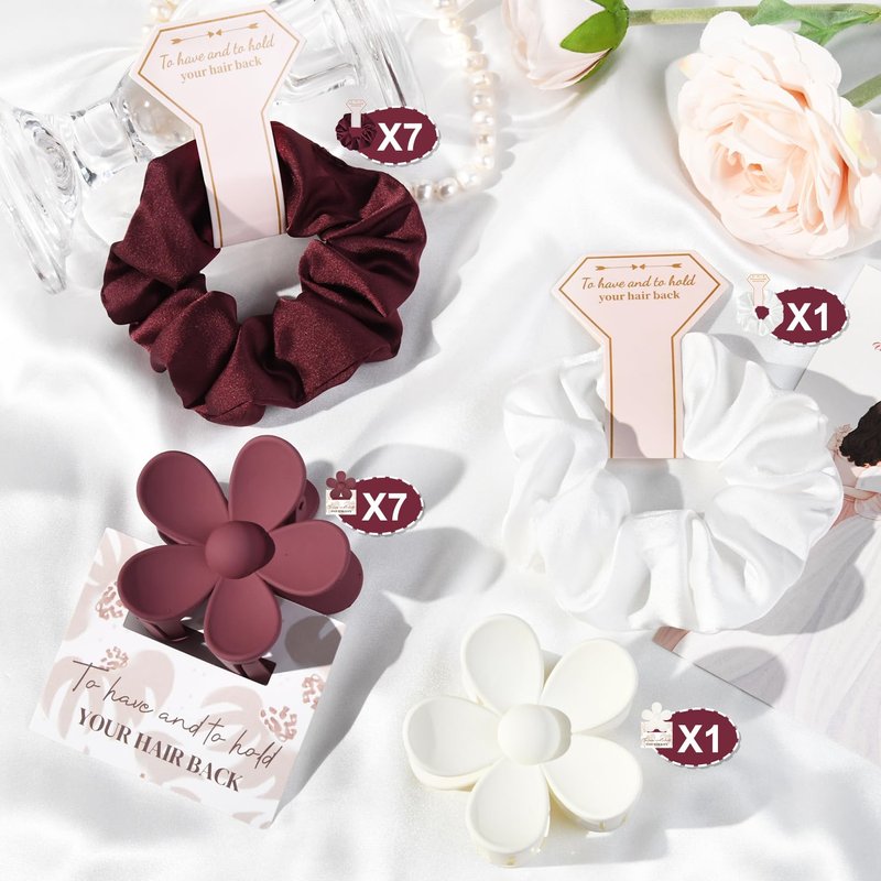 - Bridesmaid Gift Set of 8- Each set includes 8 beautifully crafted flower-shaped clips and 8 satin hair scrunchies, measuring approximately 2.8 inches in length and width. These clips and scrunchies come packaged with adorable paper cards, each featuring a 'to have & to hold your hair back' design, adding an extra touch of elegance to your bridesmaid gift boxes.