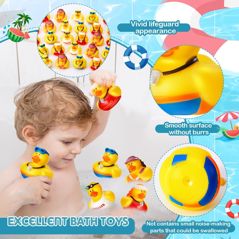 Features: Our floating ducks are uniquely designed to resemble lifeguards, providing educational interaction by helping them understand the role of a lifeguard. Each duck stands out with its design, promising a fun way to stay safe and retain knowledge. Besides bath time companion, these rubber duck float is a good choice for various events like pool parties, carnivals, birthday celebrations, and even as charming car decorations, adding a touch of fun-filled joy to any occasion. Specifications: Material: rubber Color: multicolor Size: length and width about 2 x 2 inches Package includes: 24 x Rubber Ducks Notes: Manual measurement, please allow slight errors on size. The color may exist a slight difference due to different screen displays. Suitable for people over 6 years old, and it's recommended to use under the supervision of adults in case of choking risk. Please note that ducks do not float upright on water, please choose carefully before buying.