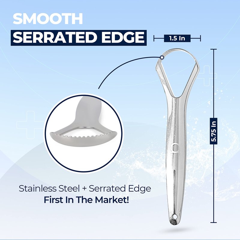 A group of dentists tried all different sizes and shapes of tongue scrapers available, and came up with this new design to make the job more effective. You want the best tongue scraper made of stainless steel with a serrated edge for maximum tongue scraping cleaning, now it's here! You deserve the BEST!