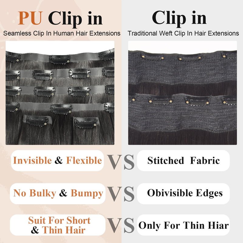 - 【Human Hair Clip in Hair Extensions Advantage】: Invisible PU Weft Clip in Human Hair Extensions Press Hair on PU with Clips, Thin Weft Edge. It is Suits Almost All Ladies, Easy to Wear and Go, Beginner-Friendly, Versatile, and Perfect for Everyday Wear.