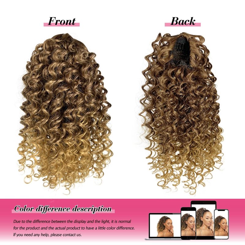 Deep Curly Drawstring Ponytail Extension for Black Women Afro Kinky Curly Pony Tail Hair Piece Synthetic Hair Extensions With 2 Clips 14 Inches (T33/27)