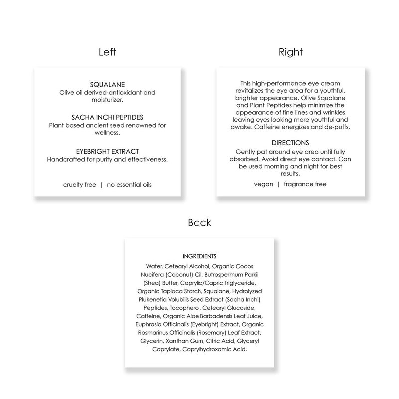 What it is: This high-performance eye cream revitalizes the eye area for a youthful, brighter appearance. Olive squalene and plant peptides help minimize the appearance of fine lines and wrinkles leaving eyes looking more youthful and awake. Caffeine energizes and de-puffs. Skin Type: All skin types (aging skin, problem skin). Skincare Concerns: Anti-aging, fine lines/wrinkles, dryness, loss of firmness/elasticity, dullness. Formulation: Cream. Highlighted Ingredients: Squalene: Olive oil derived-antioxidant and moisturizer. Sacha Inchi Peptides: Botanical based ancient seed renowned for wellness and healing. Eyebright Extract: Handcrafted for purity and effectiveness. Directions: Gently pat around eye area until fully absorbed. Avoid direct eye contact. Can be used morning and night. Ingredient Callouts: This product is vegan, fragrance-free, cruelty-free, gluten-free, and comes in sustainable glass packaging
