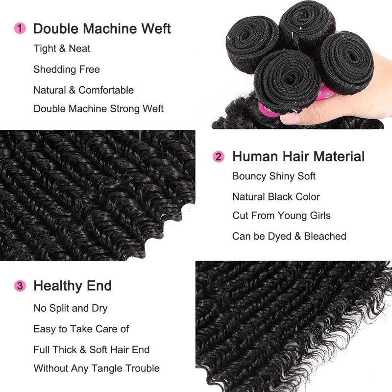 - Brazilian Human Hair Bundles Quality:Deep Wave Bundles Human Hair,16-28 Inch in Stock,Full Weight and Enough Length.Bouncy,Clean,Silky,Thick and Soft.Double Machine Weft,No Shedding,No Tangles,Healthy End.Usually Lasts 8-24 Months with Careful Care.
