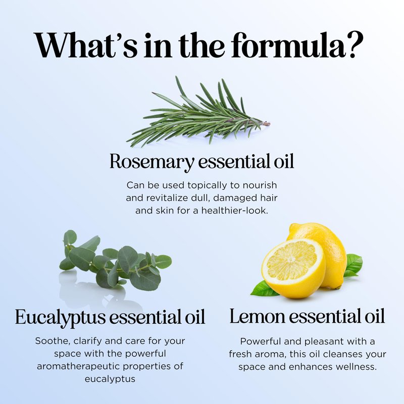 - Purifying blend - our air cleaner and room freshener blend of aromatherapy oils for diffusers features naturally cleansing essential oils such as eucalyptus and lemon oil to keep your spaces clean