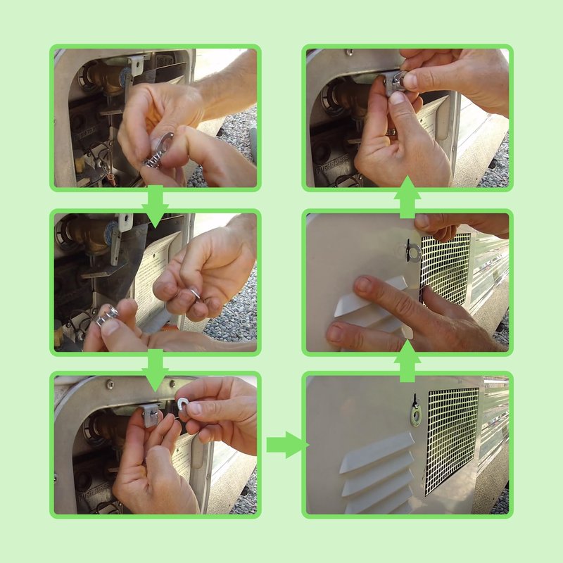 - ⭐ Easy installation process: Our rv water heater door latch features an easy-turn thumb-operated design, allowing for quick and effortless replacement of broken door latches. To install the cam lock, compress the spring and place the flat part to the side to remove the old lock. Then, insert the V-shaped part with the spring on it through the hole on the cover. Push the spring until you can secure it with the flat part.