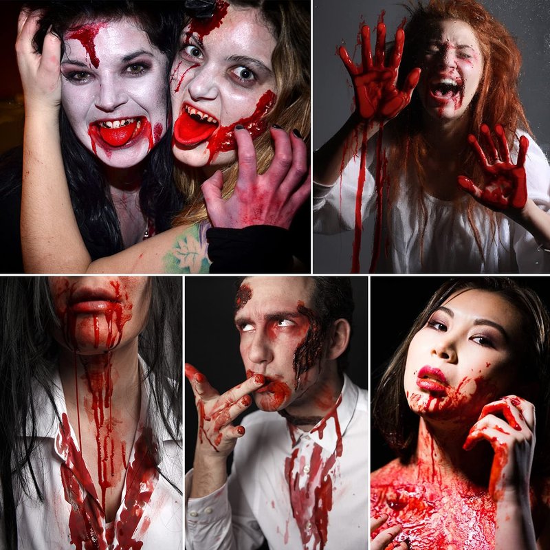 - WIDE OCCASIONS - Our fake blood makeup is great for creating frightfully realistic special effects for all Halloween,haunted houses, carnivals, fiesta and theater!Perfect for the budding effects enthusiast, horror film junkie, and Halloween costume killers creating zombie, vampire monsters, clowns and other Gory Scene makeup!