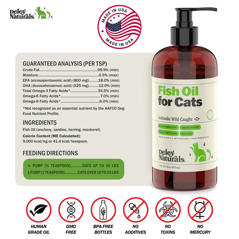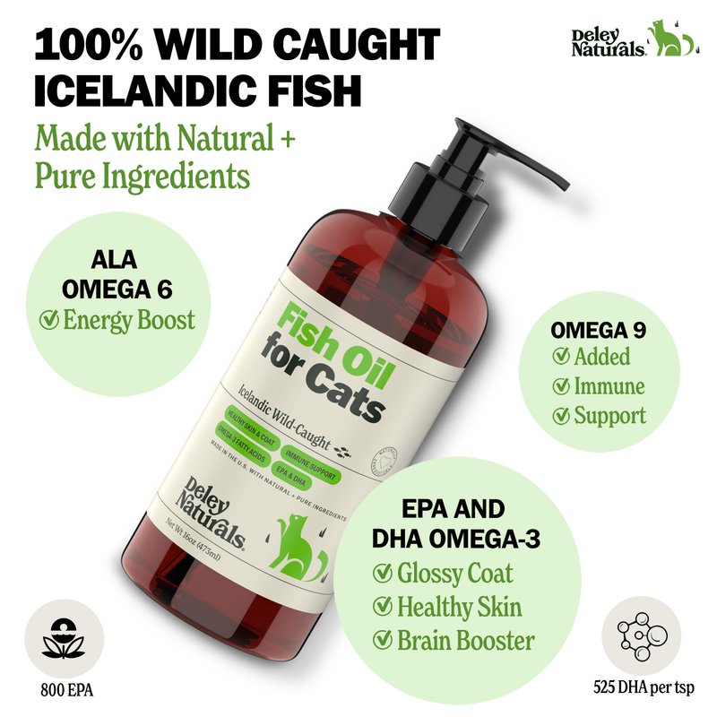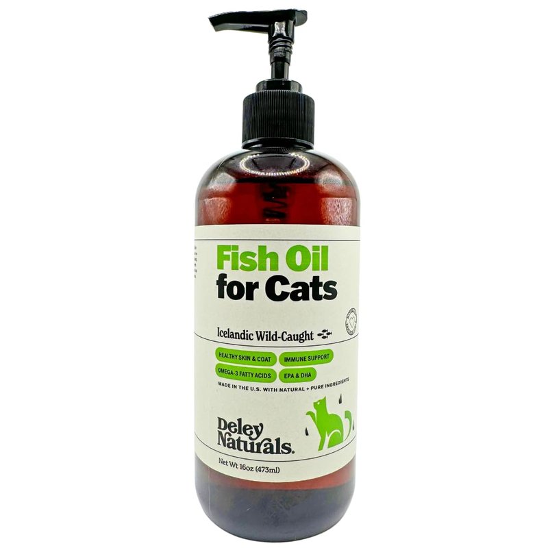 - PURE FISH OIL - Deley Naturals Wild Caught Omega-3 Fish Oil for Cats is 100% pure fish oil and has no added ingredients. Our all natural, sustainably sourced liquid fish oil supplement has virtually no odor but has a delicious fish flavor all cats love!