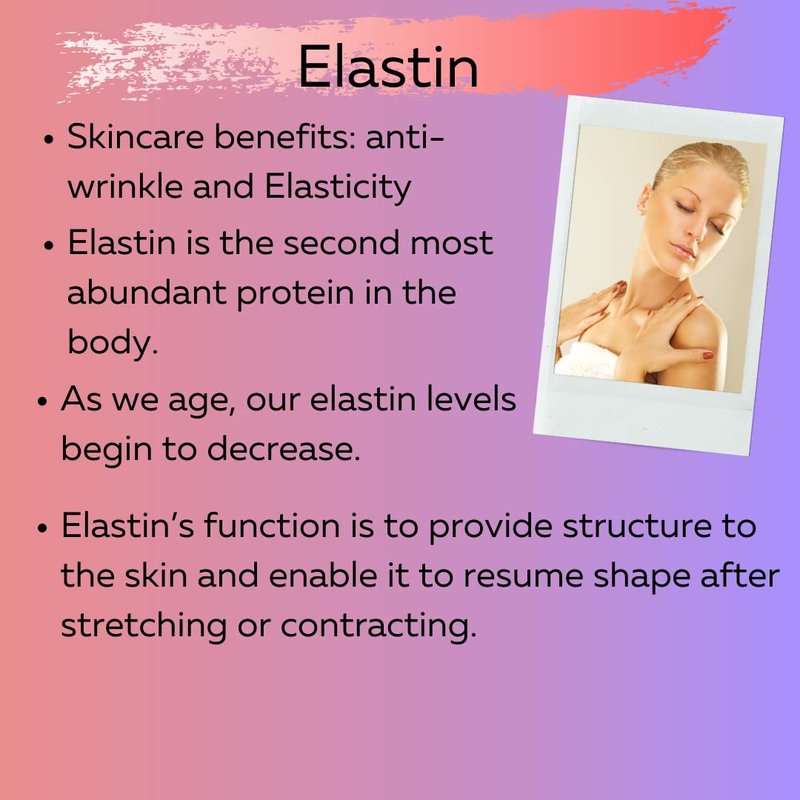 - ELASTIN is a fundamental component of skin tissue, and it delivers superior hydrating properties.