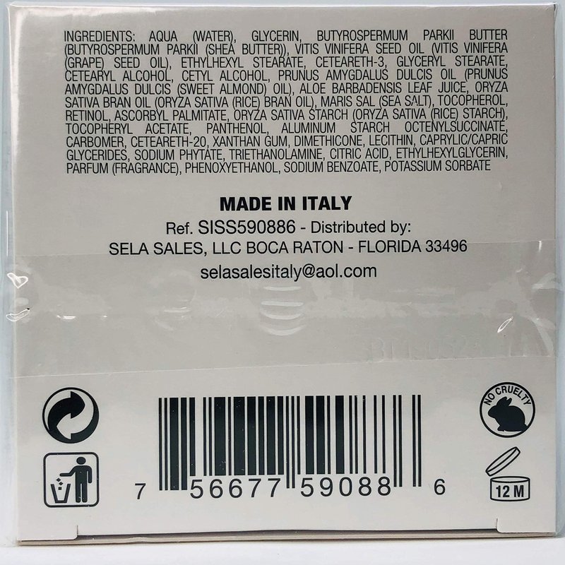 Aqua (Water), Glycerin, Butyrospermum Parkii Butter (Butyrospermum Parkii (Shea Butter), Vitis Vinifera Seed Oil Vitis Vinifera (Grape) Seed Oil), Ethylhexyl Stearate, Ceteareth-3, Glyceryl Stearate, Cetearyl Alcohol, Cetyl Alcohol, Prunus Amygdalus Dulcis Oil (Prunus Amygdalus Dulcis (Sweet Almond) Oil), Oryza Sativa Bran Oil (Oryza Sativa (Rice Bran Oil), Aloe Barbadensis Leaf Juice, Oryza Sativa Starch (Oryza Sativa (Rice) Starch), Maris Sal (Sea Salt), Retinol, Tocopherol, Ascorbyl Palmitate, Panthenol, Tocopheryl Acetate, Aluminum Starch Octenylsuccinate, Ceteareth-20, Xanthan Gum, Carbomer, Lecithin, Caprylic/Capric Glycerides, Dimethicone, Sodium Phytate, Triethanolamine, Citric Acid, Ethylhexylglycerin, Parfum (Fragrance), Phenoxyethanol, Sodium Benzoate, Potassium Sorbate, Limonene Coumarin