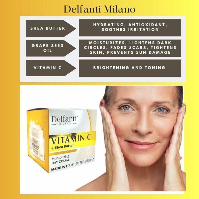 DELFANTI MILANO MOISTURIZING DAY CREAM WITH VITAMIN C AND SHEA BUTTER is a concentrate of cosmetic actives for the most beautiful skin. Vitamin C, Shea Butter and ALoe Vera work to deeply hydrate the skin, for a face and neck aboe to retain their youthful appearance. TO USE: Apply every day to a cleansed face and neck, avoiding direct eye contact.