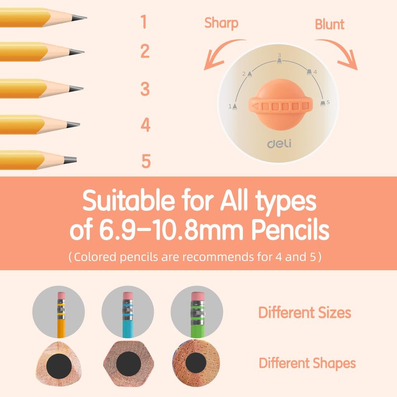 - ✏5 SHARPNESS OPTIONS✏: The 5 settings cover almost all your needs including drawing fine lines and covering a large area. The bluntest tip is really thick for both the expert artists to shade and kids who’re hard on pencils. Note: Soft core pencils are recommended to use medium or blunt tip setting to avoid tip breakage.