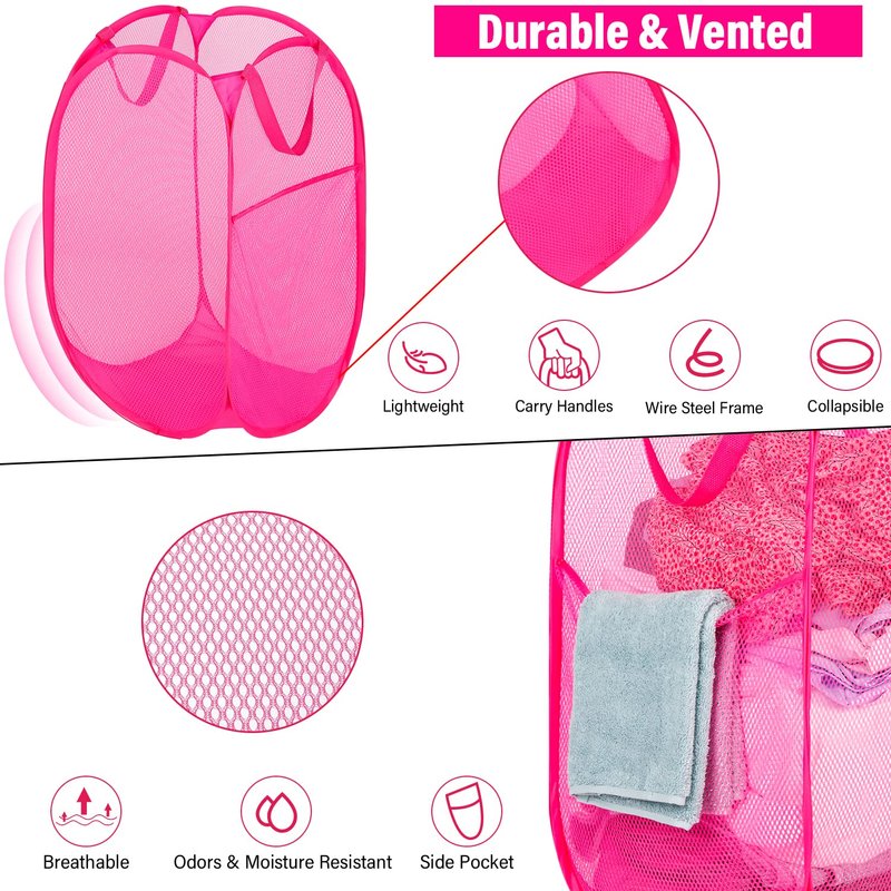 Deluxe Strong Mesh Pop up Laundry Hamper Basket with Side Pocket for Laundry Room, Bathroom, Kids Room, College Dorm or Travel Blush