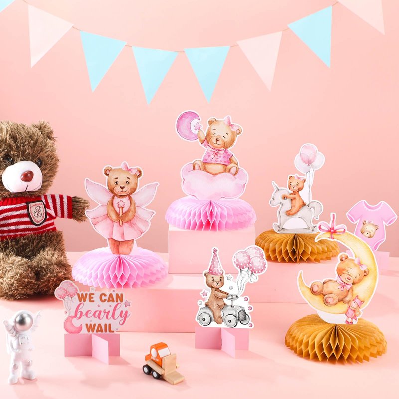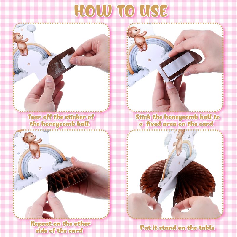 - Easy to Assemble: first, tear off the sticker of the honeycomb ball, then stick the honeycomb ball to a fixed area on the card; Repeat on the other side of the card, finally put the bear centerpieces stand on the table; It is simple to operate, save time and effort