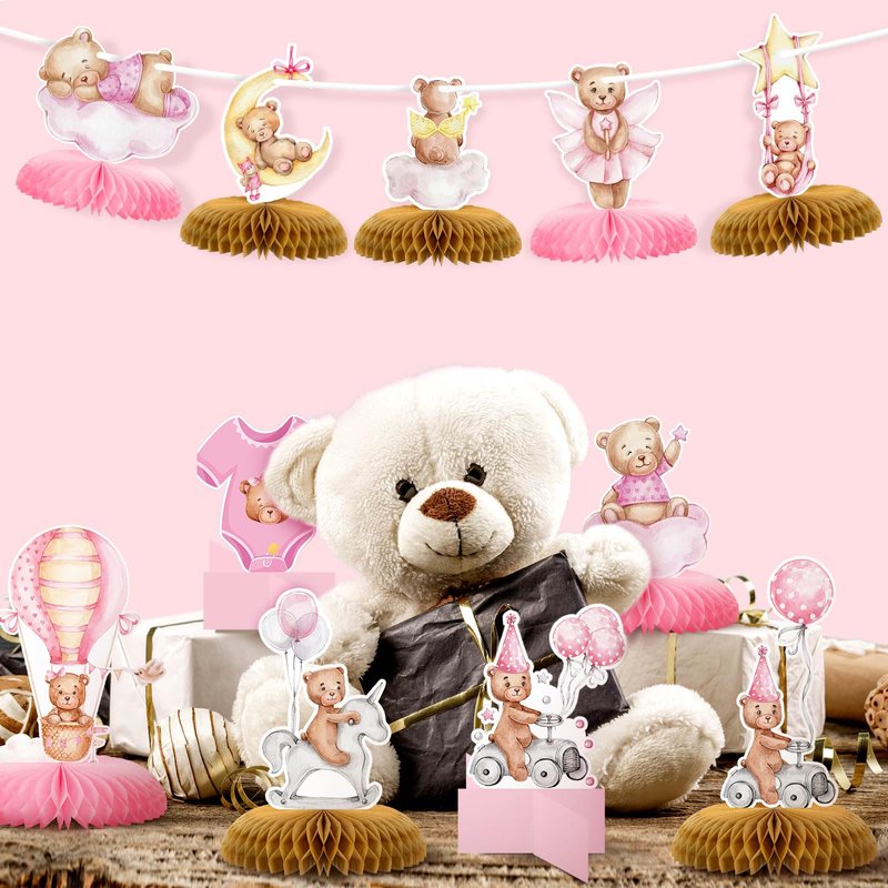 Demissle 12 Pcs Bear Baby Shower Party Honeycomb Centerpieces Table Decorations Pink Bear Balloon Centerpieces for Tables Bear Paper Cutouts for Baby Shower Kids Birthday Party Supplies