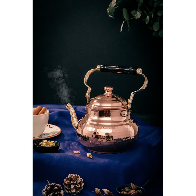 CopperBull Heavy Gauge Copper Teapot. Copper Thickness : **1mm** Capacity: 1.6 Quarts Lined with lead free tin for safety & ease of cleaning. 100% Handmad in Turkey. Suitable for gas/electric stoves. (Not for induction)