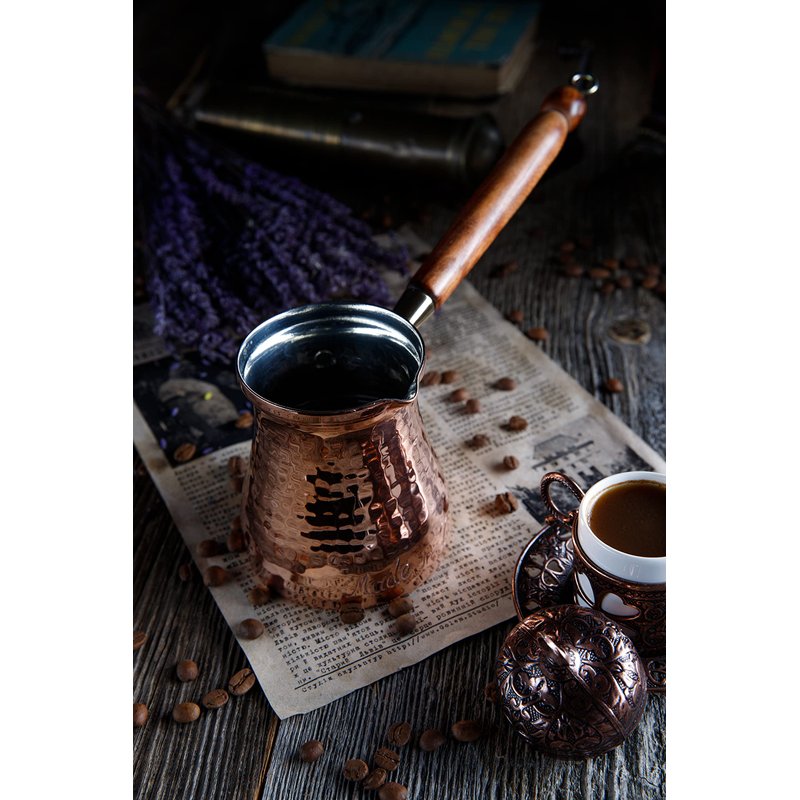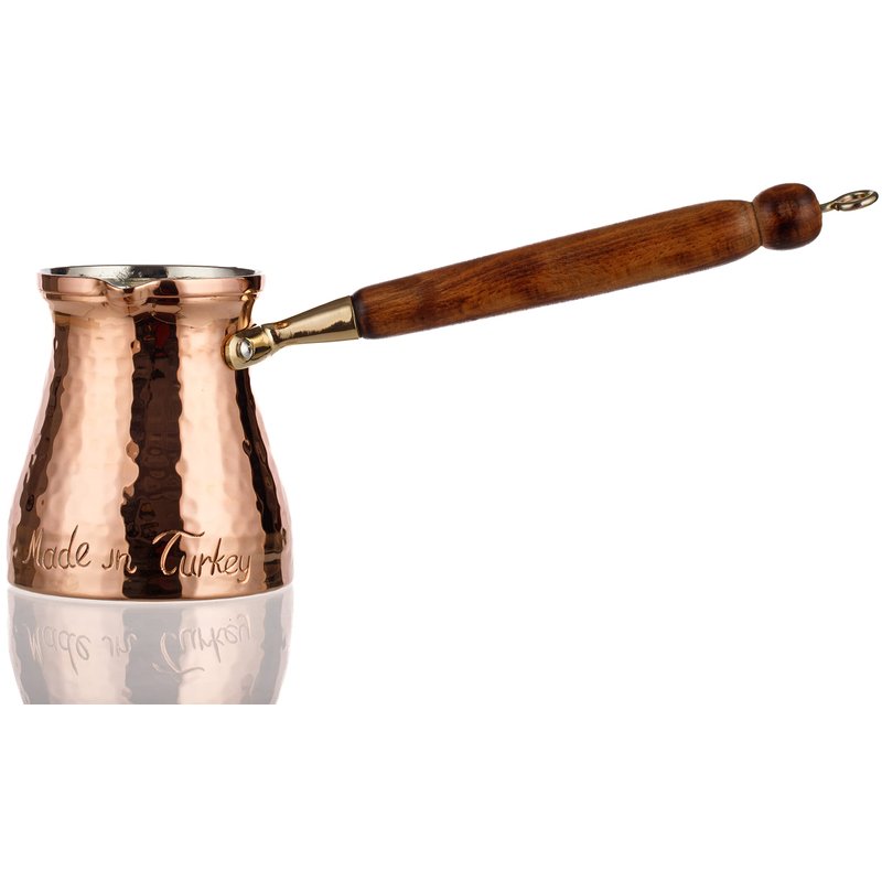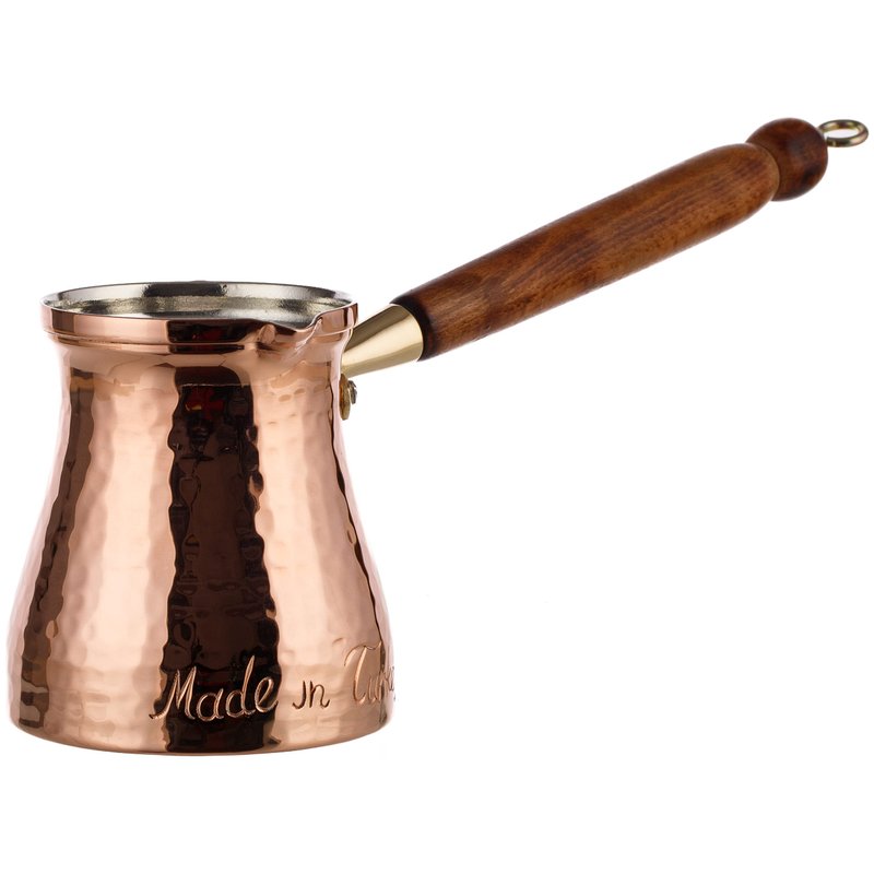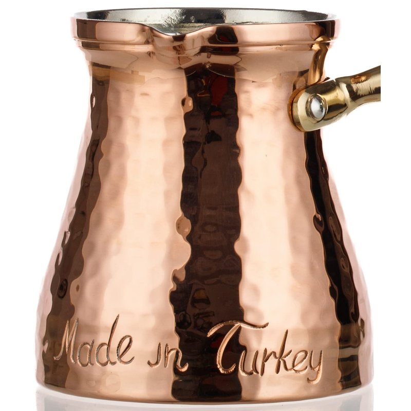 DEMMEX Signature Series Handmade Hammered Copper Turkish Coffee Pot. 100% Handmade. "Made in Turkey" Words Engraved on The Body by Copper Artisans. Material: Heavy Gauge 1mm Thick Uncoated Pure Copper & Wooden Handle. Hand-Tin Lined with Lead Free Food Grade Tin.Pure, Uncoated Copper will Naturally Develop Stains. You May Use a Copper Cleaner or Salt-Lemon Mix to Polish.