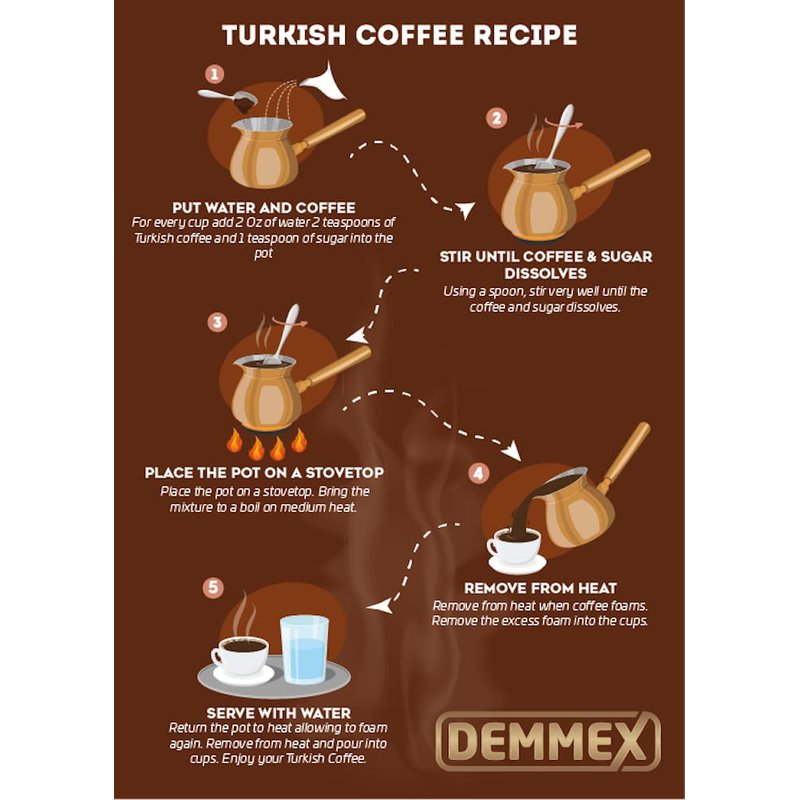 Handmade Engraved Copper Stovetop Coffee Pot with Wooden Handle & Spoon. Made in Turkey. 1mm Thick Solid Pure Copper. Not Coated. So It will Develop a Natural Patina, as Real Copper Should. Lined with Food Safe Lead-Free Tin.This Handmade Copper Pot will Last for Generations Unlike Other Thin Imitations. The DEMMEX Coffee Pot is Made with Thickest Copper Available. Thus, it has Maximum Durability.Capacity : 9 fl .Oz (270 ml) for 3 people for 3 Demitasse Cups of Coffee. Diameter:3.5" Height : 2.8"