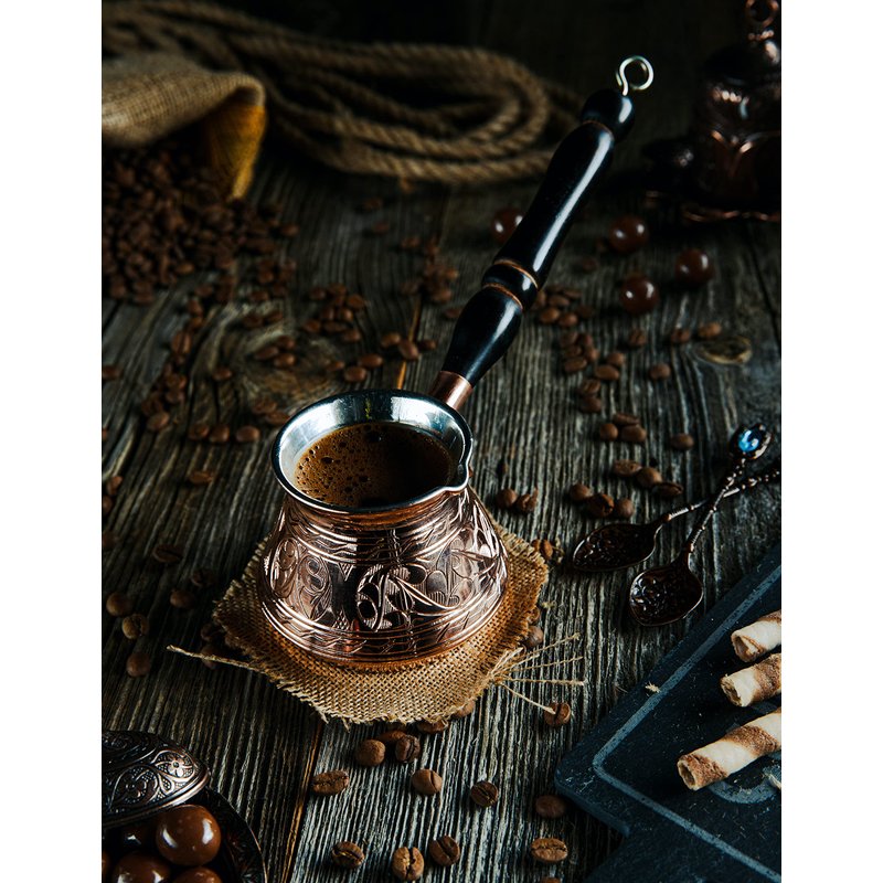 - Handmade Engraved Copper Stovetop Coffee Pot with Wooden Handle & Wooden Spoon. Made in Turkey.
