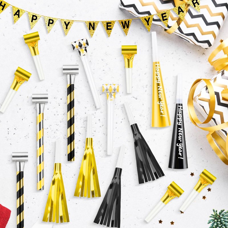 These glitter metal blowouts could make sounds to enhance the happy atmosphere, making people in a joyful mood, they are ideal celebration items, especially during New Year's Eve, birthdays, and other holidays, also suitable for parades, and family party.