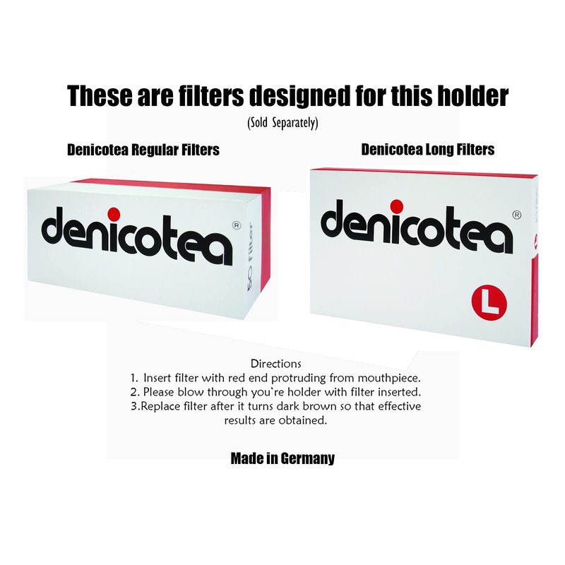 Denicotea Lady Ejector Holder with filter slot. This high quality cigarette holder has an integrated replaceable crystal filter holder and an ejector mechanism with which the stub or butt can be removed from the holder cup by pulling the cup back. This allows a hands-free removal of the cigarette butt and helps avoid cigarette residue from getting on your fingers. Unscrew this device to reveal the clever tube of crystals which filters out the tar and nicotine from the tobacco smoke as you inhale. Change the filter as required, usually between 10-15 cigarettes. This Denicotea holder can be used with Regular filters and Denicotea Long filters. The Denicotea holder design ensures that the taste is unchanged and the use is comfortable. Holder can only be used with Denicotea filters. Only an original Denicotea filter guarantees a tight fit so that no smoke can bypass the filter. This holder is suitable for normal size cigarettes only, this holder is not for slim cigarettes. Length of the holder is 116 mm long