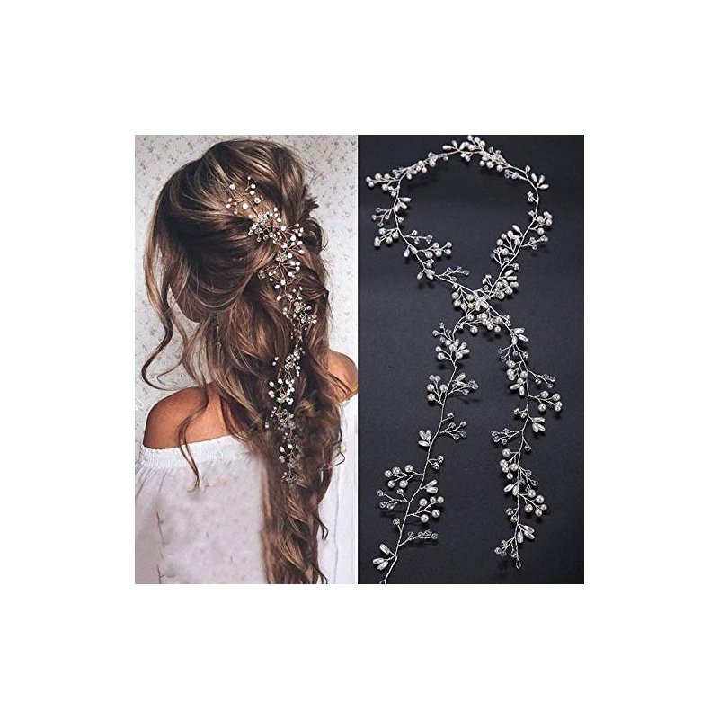 Denifery Bridal Rose Gold and Gold Silver Extra Long Pearl and Crystal Beads Bridal Hair Vine Wedding Head Piece Headband Hair Jewelry Hair Accessories (Silver)
