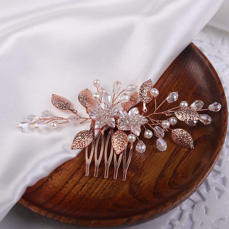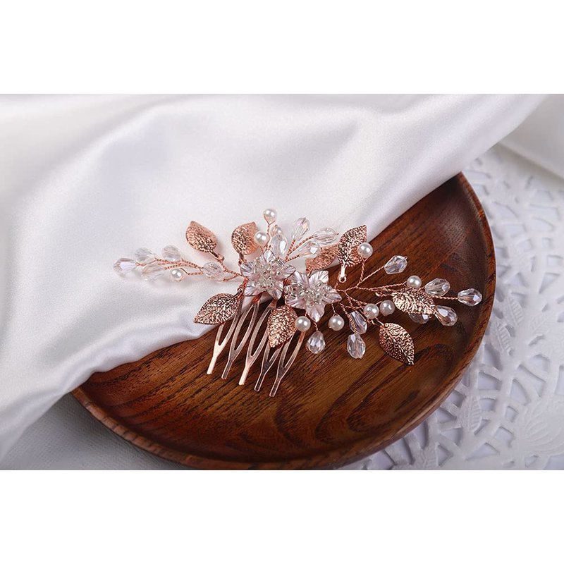 Denifery Flower Bride Wedding Hair Comb Leaf Bridal Hair Piece Pearl Crystal Headpiece for Women and Girls (Rose Gold)