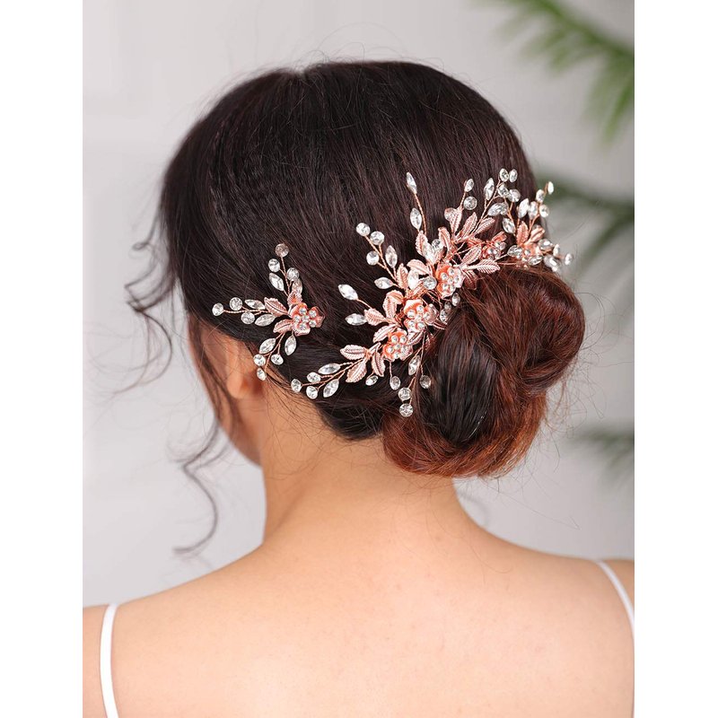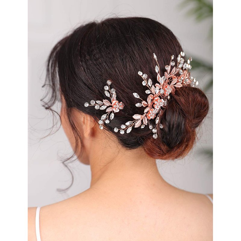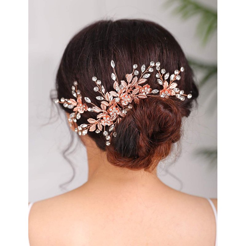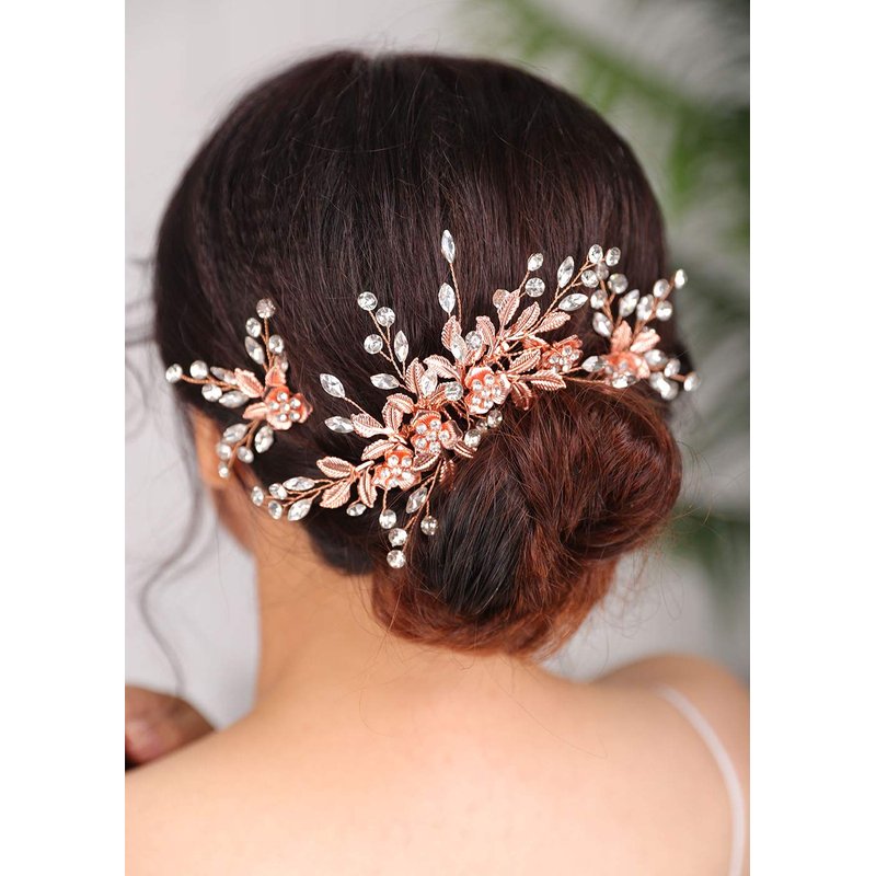 Denifery Wedding Pink Rhinestone Pearls Flower and Leaf Hair Comb Bridal Vintage Headpiece Crystal Women Hair Comb Bridal Hair Comb with 2 Pins Wedding Hair Piece Wedding Accessories