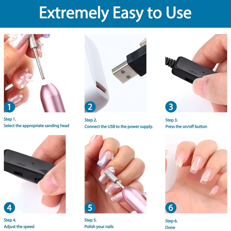 - PACKAGE INCLUDES- 1x Electric Nail Drill 1x USB cable 6* Grinding Head 6* Sanding Bands. It is perfect for the person who has a certain passion for the latest nail art trends and technologies.
