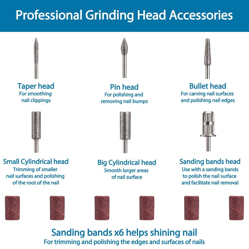 - SALON-LIKE HOME NAIL MANICURE - Six replaceable grinding heads: 1x Taper head for smoothing nail clippings. 1x Pin head for polishing and removing nail bumps. 1x Bullet head for carving nail surfaces and polishing nail edges. 1x Small Cylindrical head for trimming of smaller nail surfaces and polishing of the root of the nail. 1x Big Cylindrical head for smooth larger areas of nail surface. 1x Sanding bands head for use with a sanding band to polish the nail surface and facilitate nail removal.