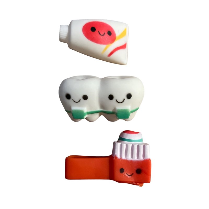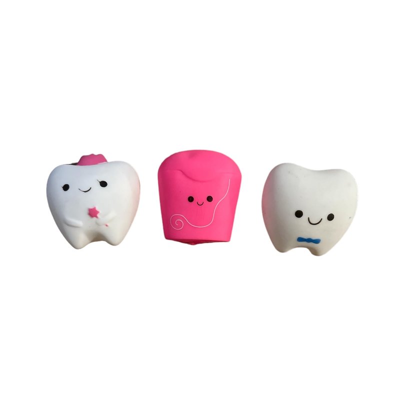 You will receive 10 adorable dentist themed rubber toys including a tooth fairy, mouthwash, floss, toothpaste, two large teeth, toothbrush, electric toothbrush, teeth with braces, and a small tooth with a toothpaste hat. These rubber dental toys measure 1.8 to 2.5 inches long and are made of high quality rubber. These grinning toys come in assorted colors including red, pink, blue, green, purple. Going to the dentist can be scary for young children. Use these tooth containers as a reward for being brave during the visit with the dentist. These adorable dentist themed toys are great as party favors, tooth fairy gifts, classroom treasure boxes, dentist prize bins, or bath toys.
