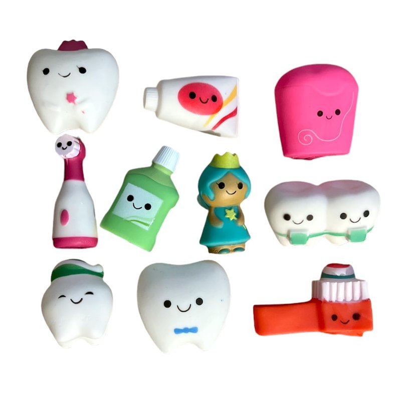- PACKAGE INCLUDES: You will receive 10 adorable dentist themed rubber toys including a tooth fairy, mouthwash, floss, toothpaste, two large teeth, toothbrush, electric toothbrush, teeth with braces, and a small tooth with a toothpaste hat.