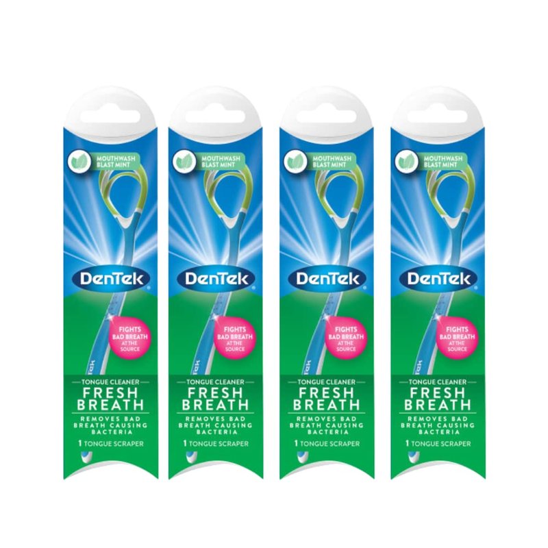 - DenTek Fresh Breath Tongue Cleaner scrapes away bad breath causing bacteria