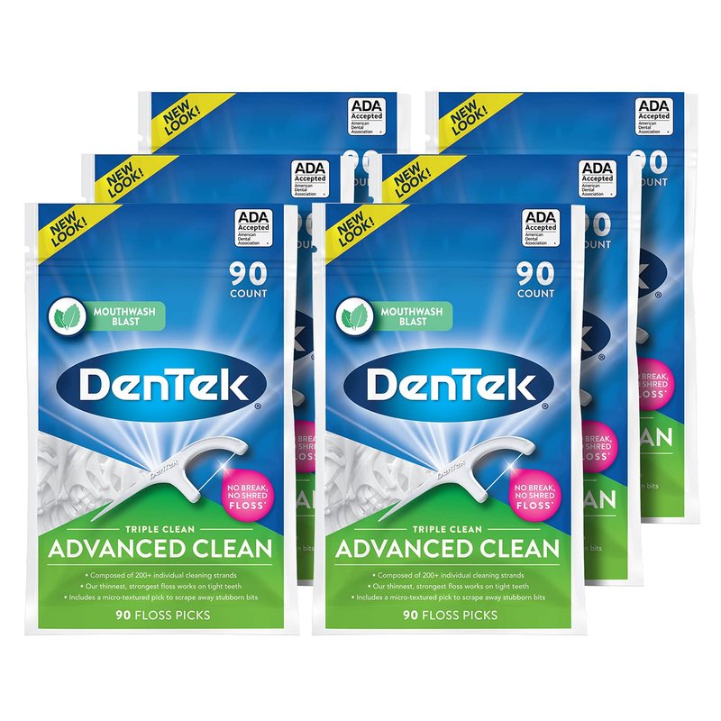 DenTek Triple Clean Advanced Clean Floss Picks, No Break & No Shred Floss, 90 Count, 6 Pack