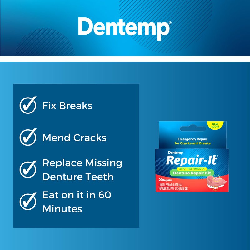 - SAFE & EASY TO USE: You crunched just a little too hard and now your denture has cracked or it’s coming a little loose and now your mouth looks conspicuously broken? Dentemp got you covered. Dentemp Repair-It has a unique formula, this denture kit is safe and easy to use. Mend and fix breaks, cracks, and loose teeth dentures within minutes with this emergency repair kit. One kit can make 3 repairs. Wash your hands before you apply this emergency denture repair kit