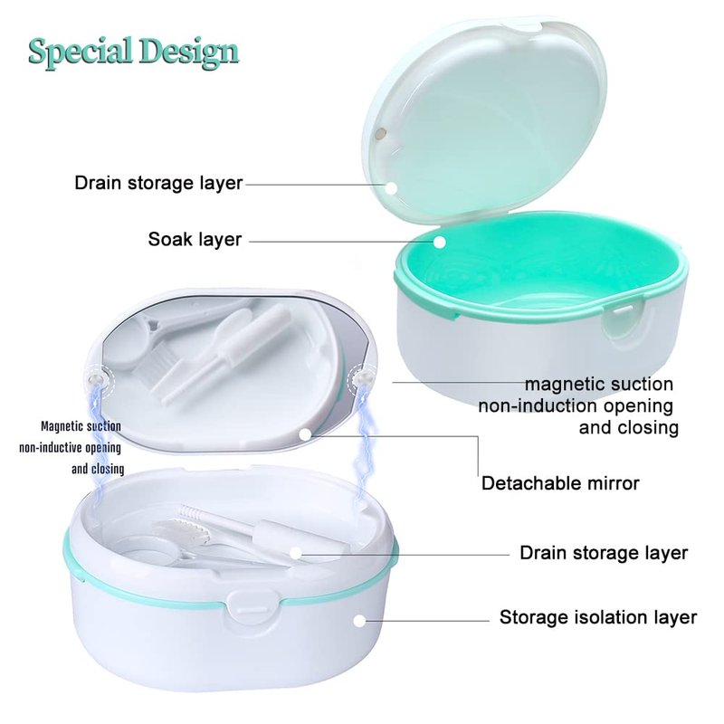 - 🟩[Easy to Clean]-✨-This denture bath is very convenient for cleaning dentures or partial dentures. Add water to the bottom layer, then put the cleaning tablet, or use soap and warm water to easily clean dentures, etc. After cleaning, you can directly lift the water filter basket to drain the water, or put It's placed on the top shelf. Very easy to clean.