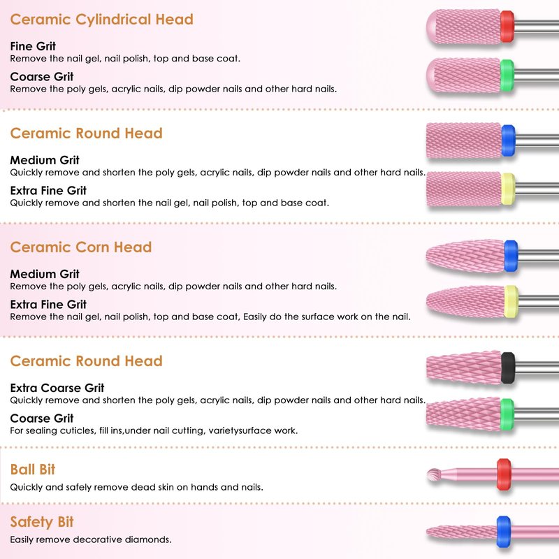 - 【10pcs Ceramic Drill Bits】This nail bits for nail drill include 4-kinds of texture ceramic nail drill bits: Fine, Medium, Coarse, and Special rough grinding patterns. They can adapt to different strengths to accomplish varied professional nail jobs. Suitable for both nail art beginners and professional manicurists