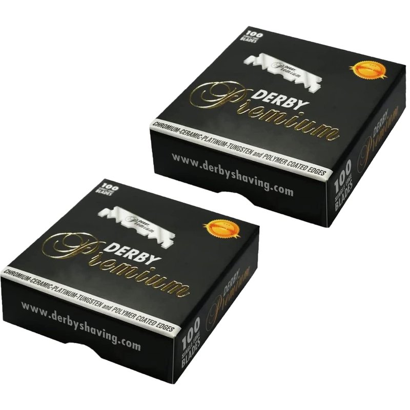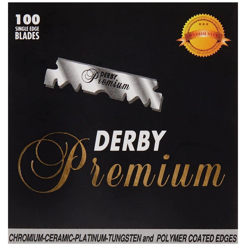 - The cardboard Derby Premium packaging contains 100 single edge blades individually wrapped in paraffin paper.