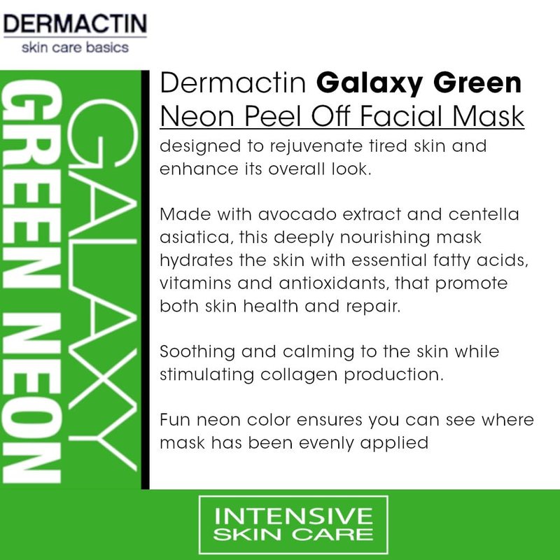 - Dermactin Galaxy Green Neon Peel Off Facial Mask is an excellent addition to any skincare routine, especially for those looking to enhance skin clarity, moisture, and overall health. Its fun neon color and effective formula make it a delightful and beneficial treatment for the skin.
