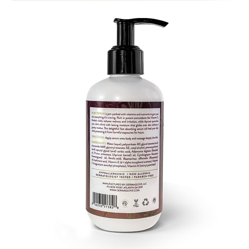 - All Natural Ingredients: Not to be confused with a simple body lotion, DERMAGLOVE BODY SERUM contains skincare ingredients usually found in face creams such as vitamins A,C, & E, Baobab oil, and Apricot kernel oil