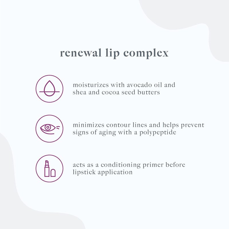 - Moisturizing Lip Care: Treat your lips to our renewal lip complex, a daily lip balm designed to smooth and nourish dry, uneven lips. This lip balm is perfect for all skin types and helps prevent aging signs caused by free radical damage.