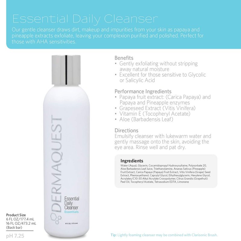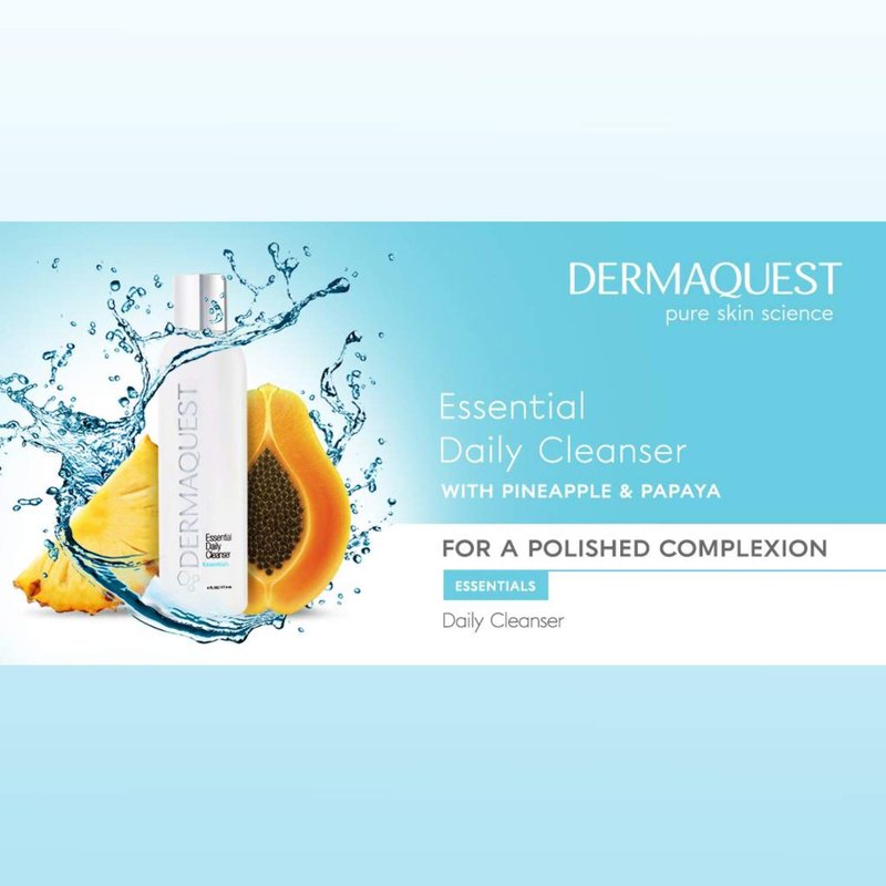 DermaQuest Essential Gentle Exfoliating Daily Facial Cleanser draws dirt, makeup and impurities from your skin as papaya and pineapple extracts exfoliate, leaving your complexion purified and polished. Perfect for those with AHA sensitivities. Gently buffs away superficial surface cells to reveal a brighter, better-balanced, and clearer complexion. Gentle, it won’t strip the skin of its protective lipid layer nor irritate. Anti-aging ingredients protect while botanical extracts seal in moisture for long-lasting lipid lubrication. Our Essentials Collection delivers the nourishment, protection and balance that your skin deserves. Brimming with vital enzymes, vitamins, minerals and nutrients, these core products will revitalize any skin type, and effectively prepare skin to address specific concerns with at-home products and professional treatments. DermaQuest’s exclusive products are the most advanced skin care formulas available due to the following factors: Innovation: With our entire operation under one roof, our chemists have the unique advantage of being able to interact with all other departments, receive feedback and concerns from clients directly to the lab for review. Quality: We incorporate the highest industry standards. Quality control is our highest priority and is ensured by professional estheticians and chemists. Value: Controlling the process from formulation through final distribution allows us to carefully manage costs, allowing us to make greater investments in RD while keeping our products affordable. Layering Technology: We use specific layering sequences to achieve maximum effectiveness and absorption of our products. Superior Ingredients: DermaQuest’s ingredients and formulas address complex skincare concerns at a cellular level, ensuring the results that clinical professionals and their clients expect. Advanced Delivery Systems: Our chemists employ and develop the most effective delivery systems for maximum absorption, ensuring superior results