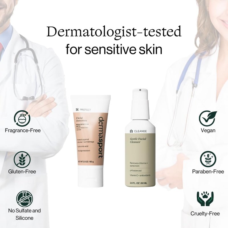 - Mindful Skin Care: Dive confidently with Dermasport's pairing of our reef-safe mineral facial sunscreen and pH-balanced gentle facial cleanser. Dermatologist-tested for sensitive skin and reflecting our commitment to both skin and the environment, both products are free from fragrance, sulfates, parabens, silicones, and gluten, and are proudly vegan. Experience top-tier skincare that's as ecologically responsible as it is effective for athletes and swimmers.