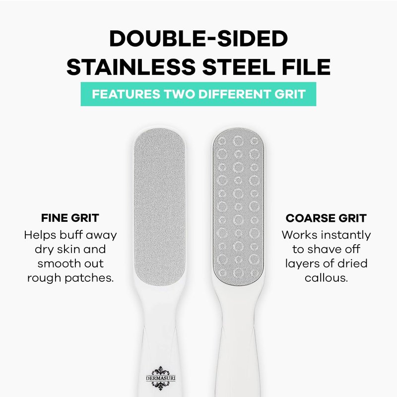 Dermasuri Double Sided Stainless Steel Foot File for soft skin Callus Remover and Foot Rasp Pedicure Kit Built with professional grade stainless steel Our foot rasp is similar to a pumice stone, foot file, or foot scraper Specialized for removing callus and dry, cracked skin Body skin care products for men and women Enjoy super soft feet and a spa pedicure at home Perfect solution to treat your dry, callused and cracked heels Gently file away the callus, making sure you do not use a lot of pressure and harm the skin Easy to use, easy to handle, and very effective! Enjoy your smooth and beautiful skin!