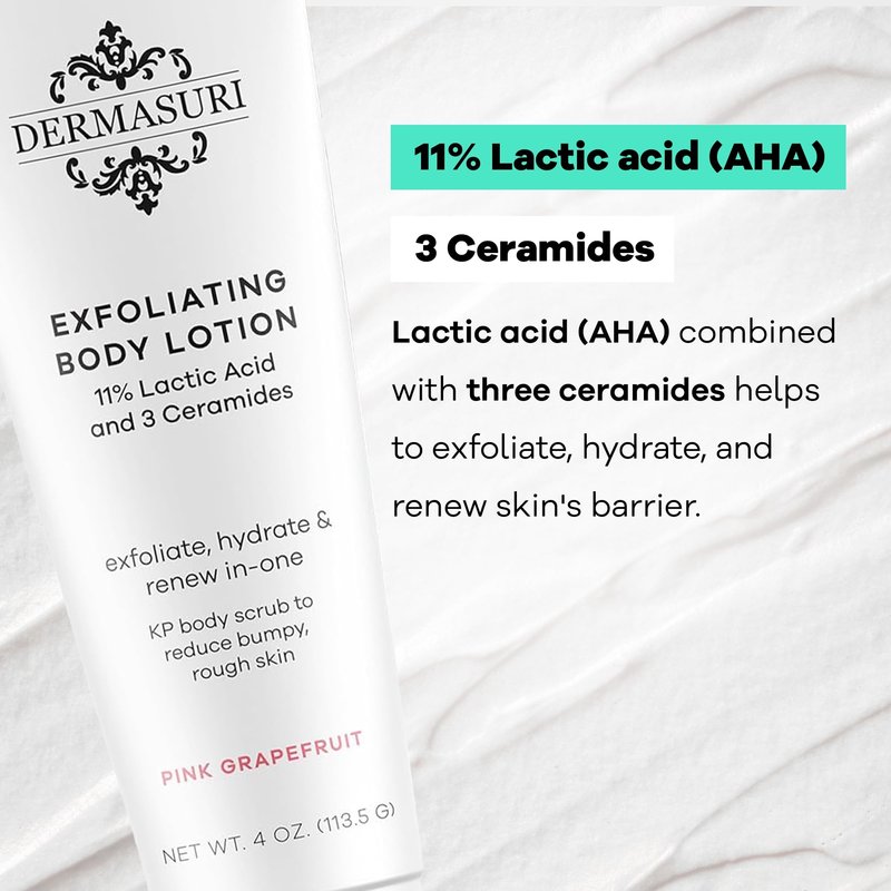 - EFFECTIVE EXFOLIATION: Dermasuri Exfoliating Body Lotion gently removes dead skin cells, helping to smooth rough and bumpy skin.