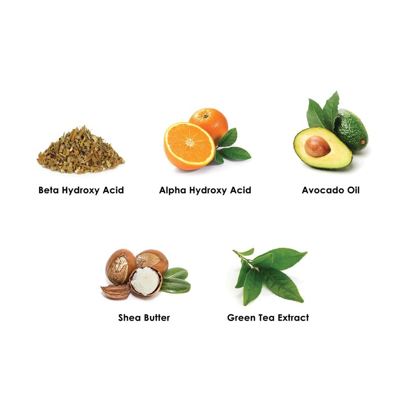 - Alpha Hydroxy Acid, Beta Hydroxy Acid, Avocado Oil, Shea Butter, and Green Tea Extract.